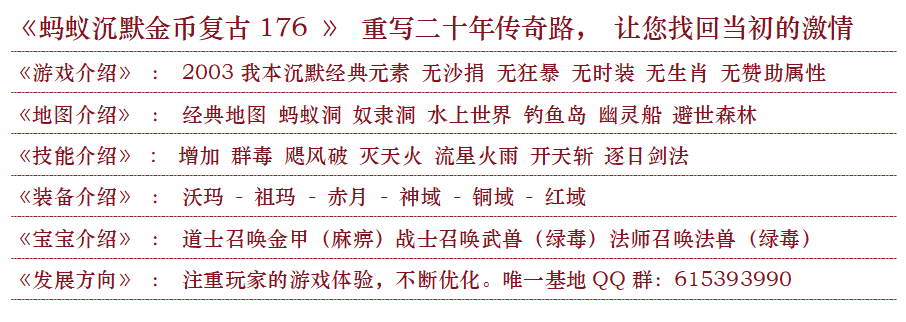 【开区规则】: 每周三 周六 14:30 与 19:30 开两区 第三天合区 第五天开启沙巴克攻城. 【蚂蚁沉默】: 原汁原味,经典复刻,特色玩法,沉默新生,兄弟重聚,情谊再续,回归本真,初心不改 【蚂蚁沉默】: 全新版本,全新地图,全新玩法 不一样的感觉 召唤曾经的兄弟一起激情到底 |